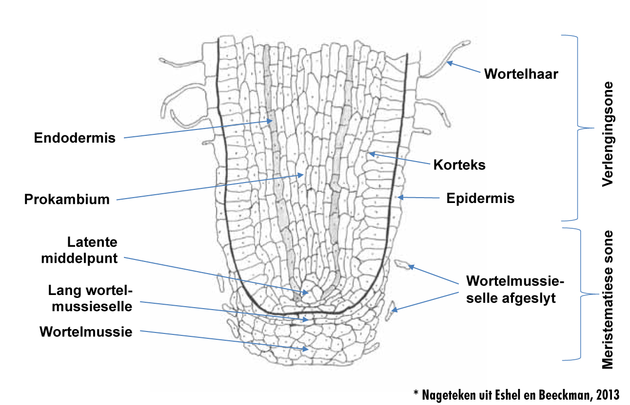 Om die artikel beter te verstaan, is dit nodig om kortliks na die morfologie van die wortelpunt te verwys (Figuur 1), aangesien dit ook is waar die aspekte wat wortelgroei beïnvloed die grootste impak het. Die meristematiese gedeelte is waar die selverdeling plaasvind. Dit vorm aan die voorpunt die wortelmussie se selle en aan die agterkant die selle wat later in die verlengingsone gaan verleng. Dit is veral na hierdie sones waarna daar telkens in hierdie artikel verwys gaan word.