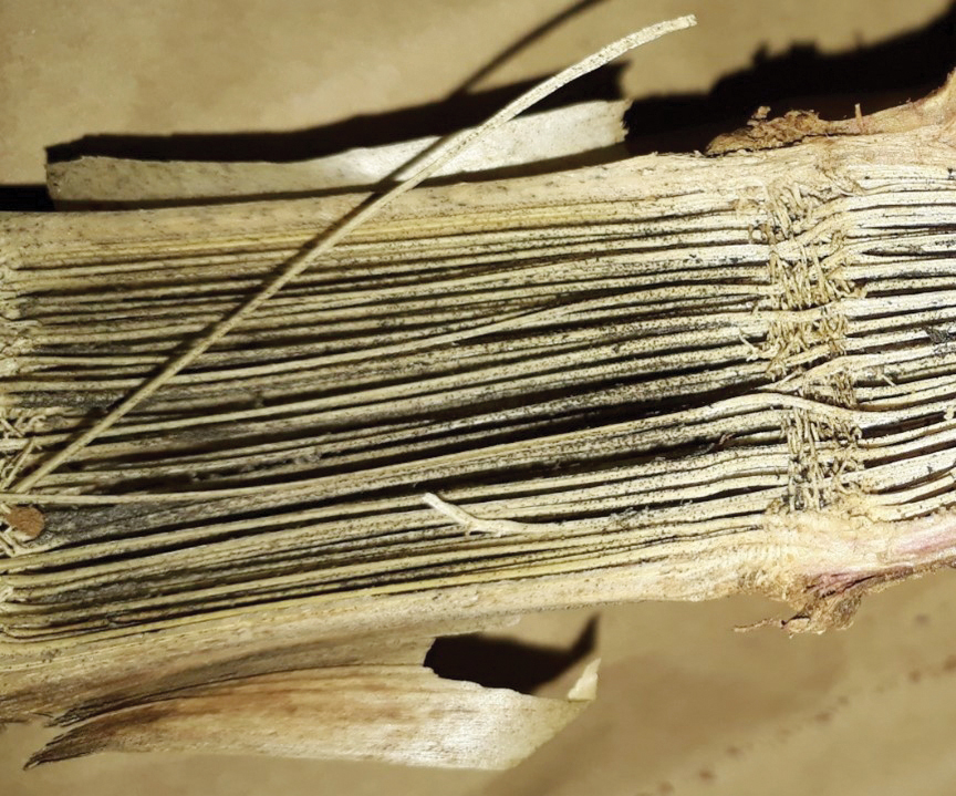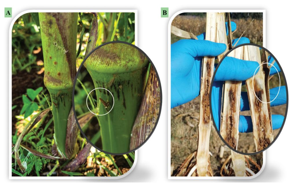 When conditions are favourable, M phaseolina can infect maize at an early stage of the plant’s lifecycle and cause a variety of symptoms, such as root rot, seedling blight, seedling damping off, collar rot, basal stem rot, stunting, chlorosis, wilting and premature senescence, in which the dry leaves stay on the stems. Charcoal rot can cause early leaf drying, plant lodging and tassel dropping by spreading from diseased internodes to the healthy nodes.